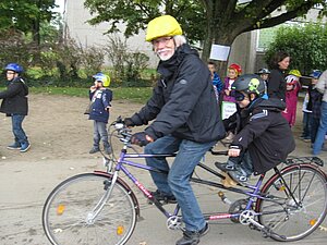 In 45 Grundschulen haben seit 2006 insgesamt 9438 Kinder den „Ganz normalen Tag“ mitgemacht. „Sensibilisierung von Kindern für Menschen mit Handicap“ bezeichnen Bernhard Weik und Elmar Widera dieses einmalige Projekt. „Eine eingeschworene Gemeinschaft kann mehr bewirken als ein Einzelkämpfer“ – so bezeichnet Weik die ehrenamtliche Mitarbeit seines Teams beim „Ganz normalen Tag“, zu dem auch die Tandem-Piloten des ADFC gehören. Jetzt haben einige dieser ADFC-Unterstützer – Herbert Jakubiak, Jo Ruppel und Christian Doll – ein besonders gutes Werk getan: Die durch viele Veranstaltungen in den Schulen beanspruchten Rollstühle der Weik-Stiftung wurden „auf Herz und Nieren“ geprüft, bei den ersten zwei Rollstühlen wurden die luftbereiten Räder gegen Vollgummireifen ausgetauscht (die weiteren werden noch später gewechselt). „Wir haben jede Schraubverbindung überprüft“, erklärte Jakubiak, der auch die Einteilung der ADFC-Tandempiloten für die einzelnen Projekttage in den Grundschulen vornimmt.