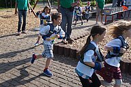 Leichlingen-Witzhelden/Langenfeld (jste). „Jeder ist unterschiedlich, einer zu groß, zu klein, zu alt oder zu jung, manche haben ein Handicap und für die ist das normal. Es ist eine tolle Sache, dass ihr probieren wollt, dass nicht alle gleich sind“, rief die Rektorin der Gemeinschaftsgrundschule Witzhelden, Birgit Jürgens, den 162 Schülern zu. Sie hatten sich mit den zahlreichen Helfern, dem Team der Elisabeth & Bernhard Weik-Stiftung und dem Lehrerkollegium auf dem Schulhof zum „Ganz normalen Tag“ versammelt. „Die Kinder werden für Menschen mit Handicap sensibilisiert und erfahren, wie es ist, mit Einschränkungen zu leben“, war die Idee von Stifter Bernhard Weik.