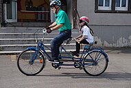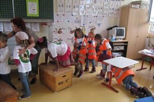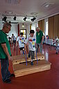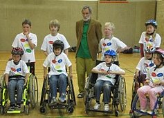 „Ein klein wenig nach vorn bücken sollte man sich im Rollstuhl, um nicht nach hinten zu kippen“, erklärte Tanja Junkes, selbst Rollstuhlfahrerin, und zeigte den Kindern, wie man losfährt, bremst und Stufen überwinden kann. Wolfgang Schmelz ließ die Schüler mit Gewichtswesten ausprobieren, wie sich Übergewichtige fühlen. „Manche Kinder müssen Tabletten nehmen und werden dadurch übergewichtig, oder sie haben eine Veranlagung dafür, obwohl sie normal essen“, klärte er auf. Hüpfen, rennen, klettern mit den zusätzlichen Pfunden war eine neue Erfahrung. „Wir sind heute jeder ca. 25 km gefahren“, rechneten die Tandempiloten Werner Decker, Peter Hahnel, Joe Ruppel und Christoph Lebelt aus, die die Schüler als „Blinde“ mit einer Schlafbrille versehen einige Runden auf dem Tandem transportierten.