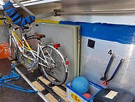 3e) Anhängerbestückung: 12 Rollstühle, 4 Tandemfahrräder, 7 Helme, 21 Krücken,