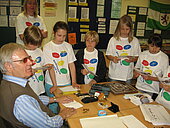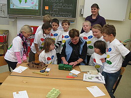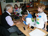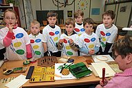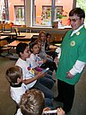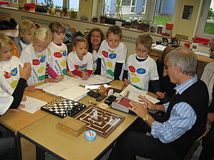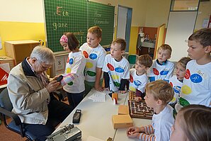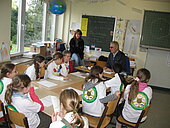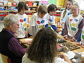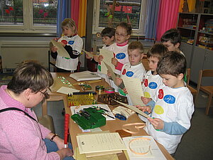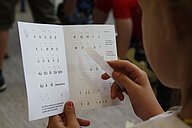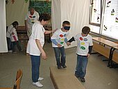 Hier besonders wichtig: Die Klasse muss in 2 Gruppen aufgeteilt werden. Für diese Station sind immer 2 nebeneinander liegende Klassenzimmer vorzusehen. Auf dem Sitzplatz der Kinder liegt das geprägte Blinden-Alphabet. (bitte liegen lassen)
