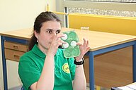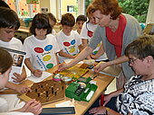 die diese Station in zwei verschiedenen Räumen durchführen. Wichtig dabei ist, dass jede blinde Person eine sehende Person als Handlanger/in hat die der Blinden die Hilfsmittel anreicht, die auf dem Tisch liegen und den Kindern gezeigt werden.
