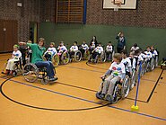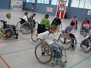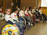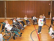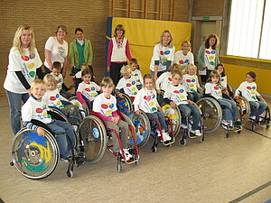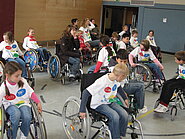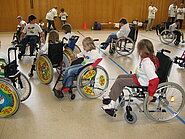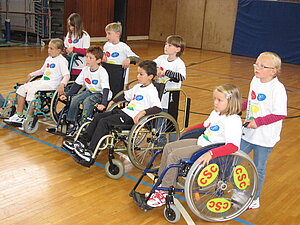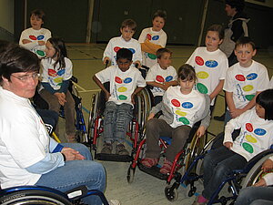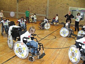 Die Kinder besetzen die Rollstühle und sind im Kreis um die „Aktive“ versammelt.