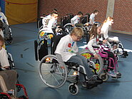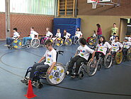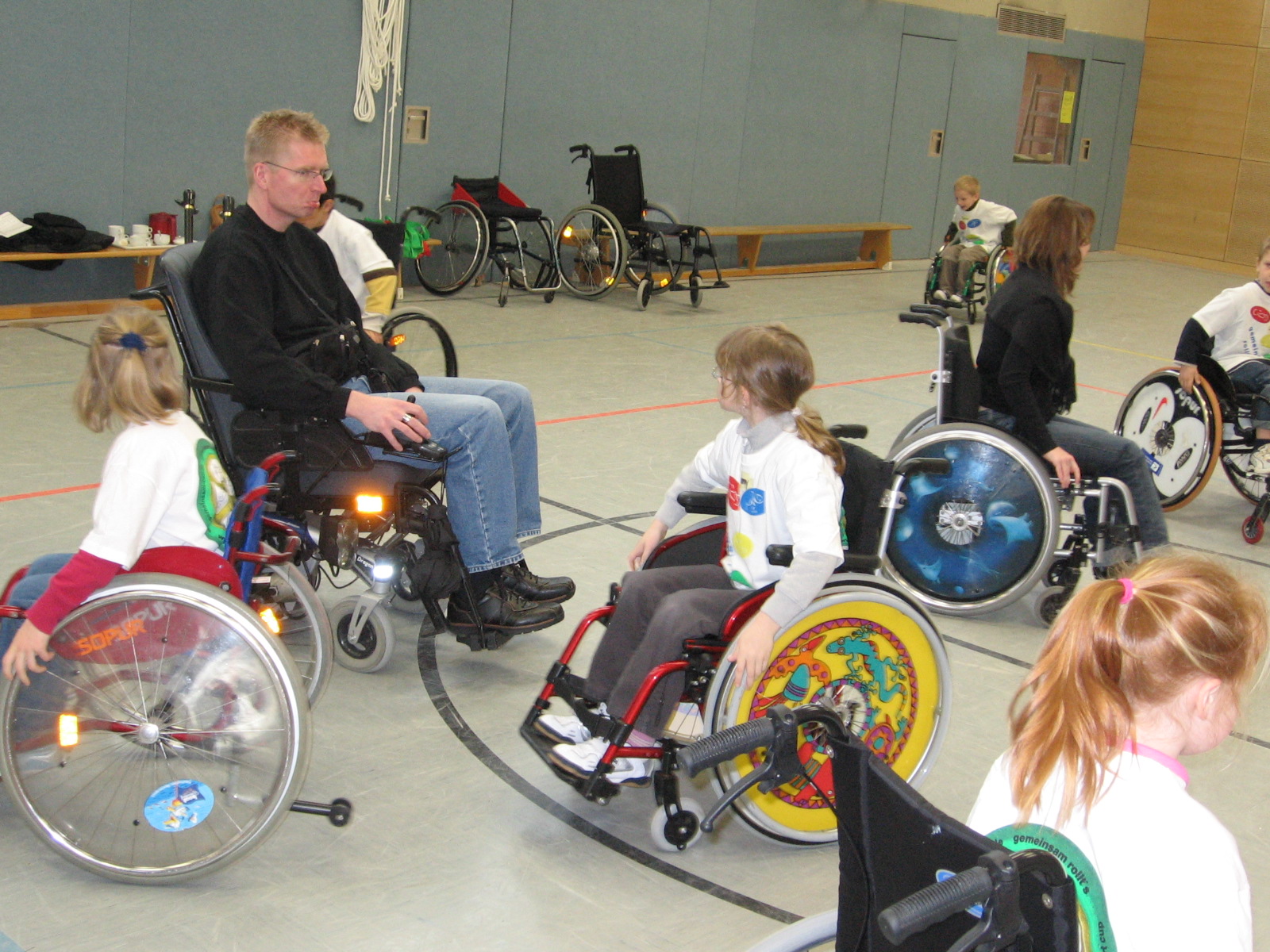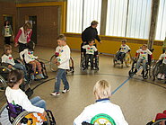 Hierfür werden die Kinder in zwei Gruppen geteilt. Eine Gruppe setzt sich in den Rollstuhl, die andere Gruppe bleibt Fußgänger. Die Rollikinder testen ihren Rollstuhl in der ganzen Turnhalle. Bremsen- Rückwärtsfahren oder Kurvenfahren.