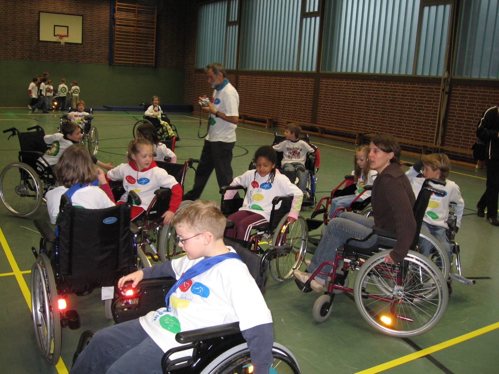 In der Halle werden mehrere Stationen aufgebaut, mit denen Alltagssituationen eines Rollifahrers durchgespielt werden können. Nur die Hälfte der Kinder sitzt in einem Rollstuhl. Jedes Rollikind bekommt ein Begleitkind, das hilfsbereit hinter dem Rolli herläuft, ohne ihn