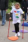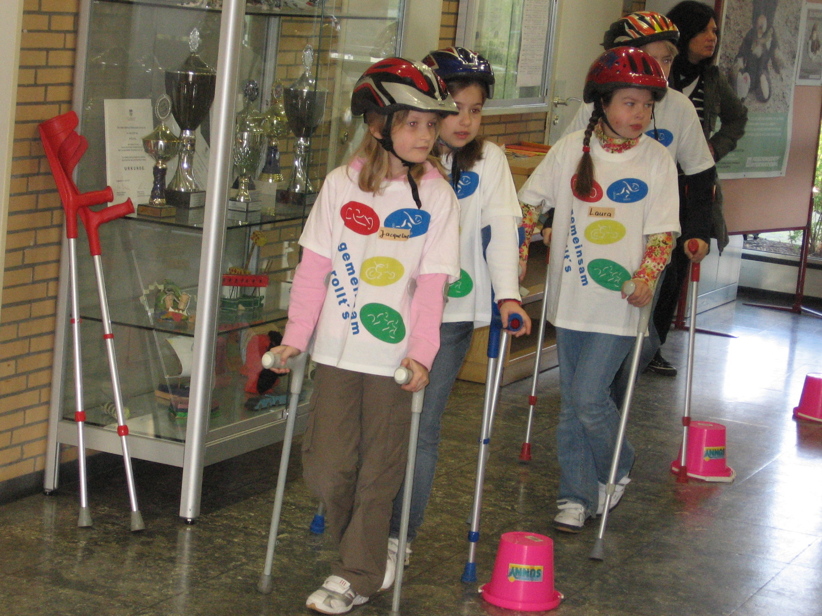 (Zum Simulieren einer Treppe). Den Kindern muss vorgemacht werden, wie die Gehhilfen („Krücken“) einzusetzen sind.