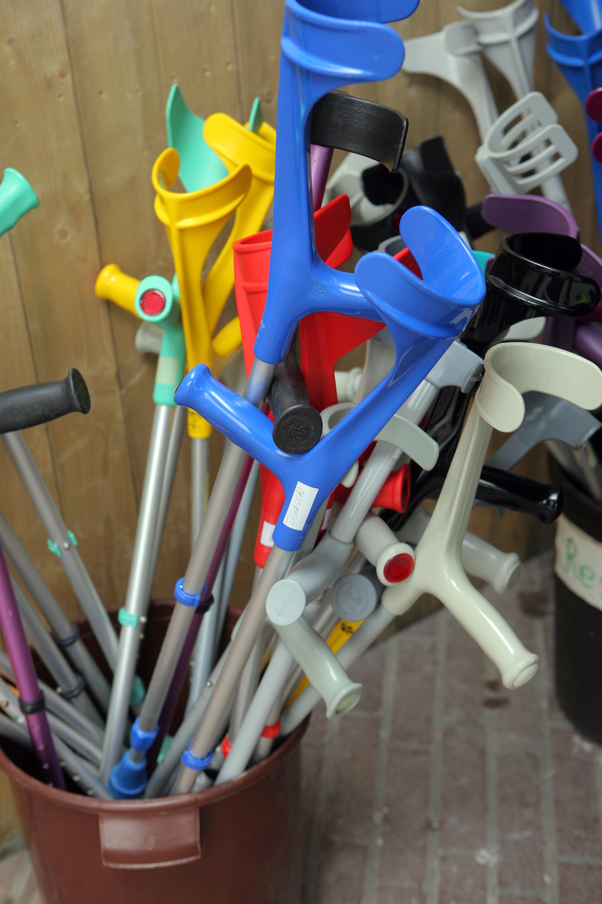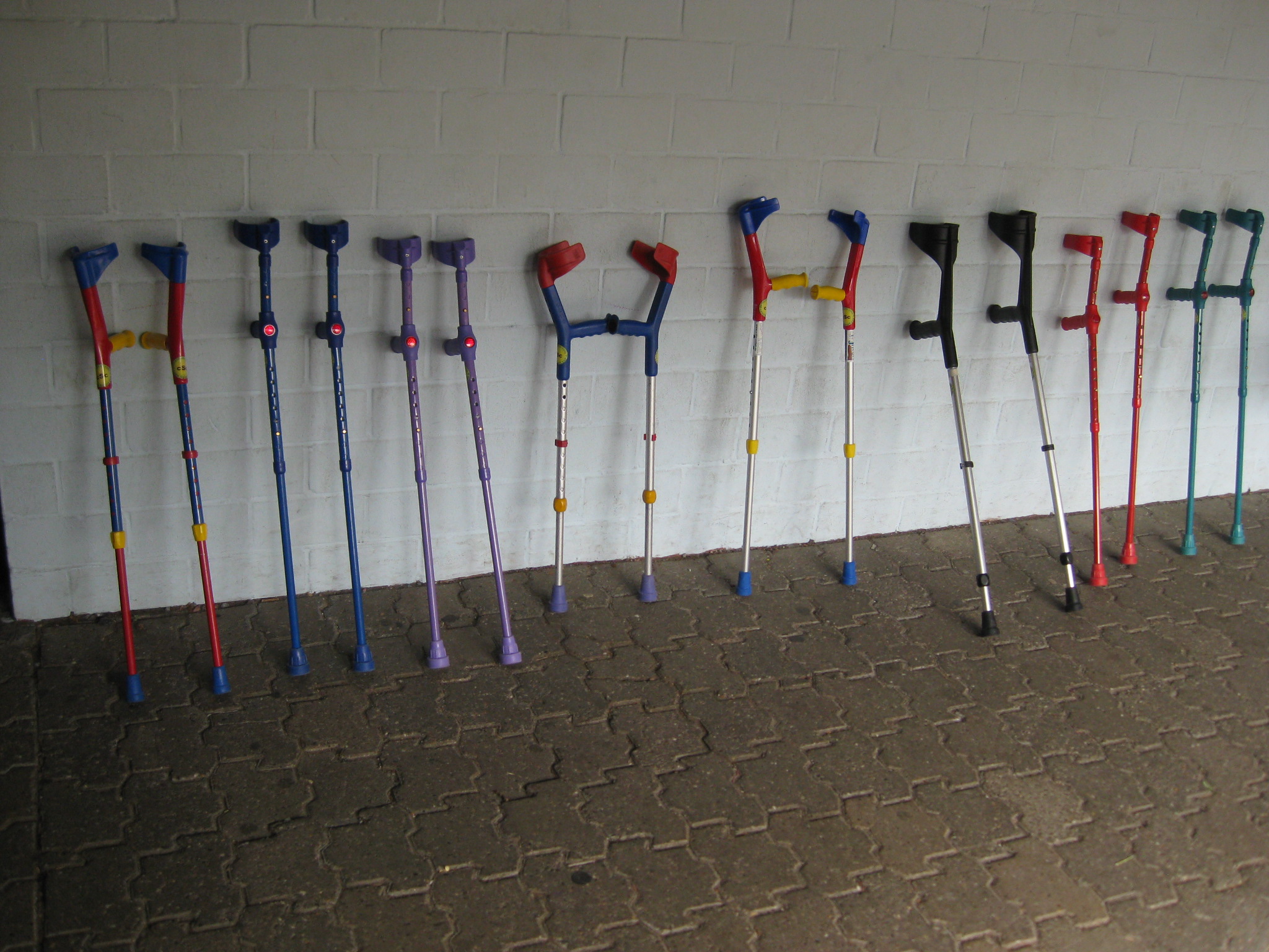 Die Gehhilfen und die Füße stehen in einer Reihe.