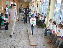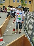 Nachdem die "Kinder" die Blindenbrille aufgesetzt haben, kann der Stellplatz der Hindernisse verändert werden. Die Kinder merken sich vorher die Lage der Hindernisse genau.